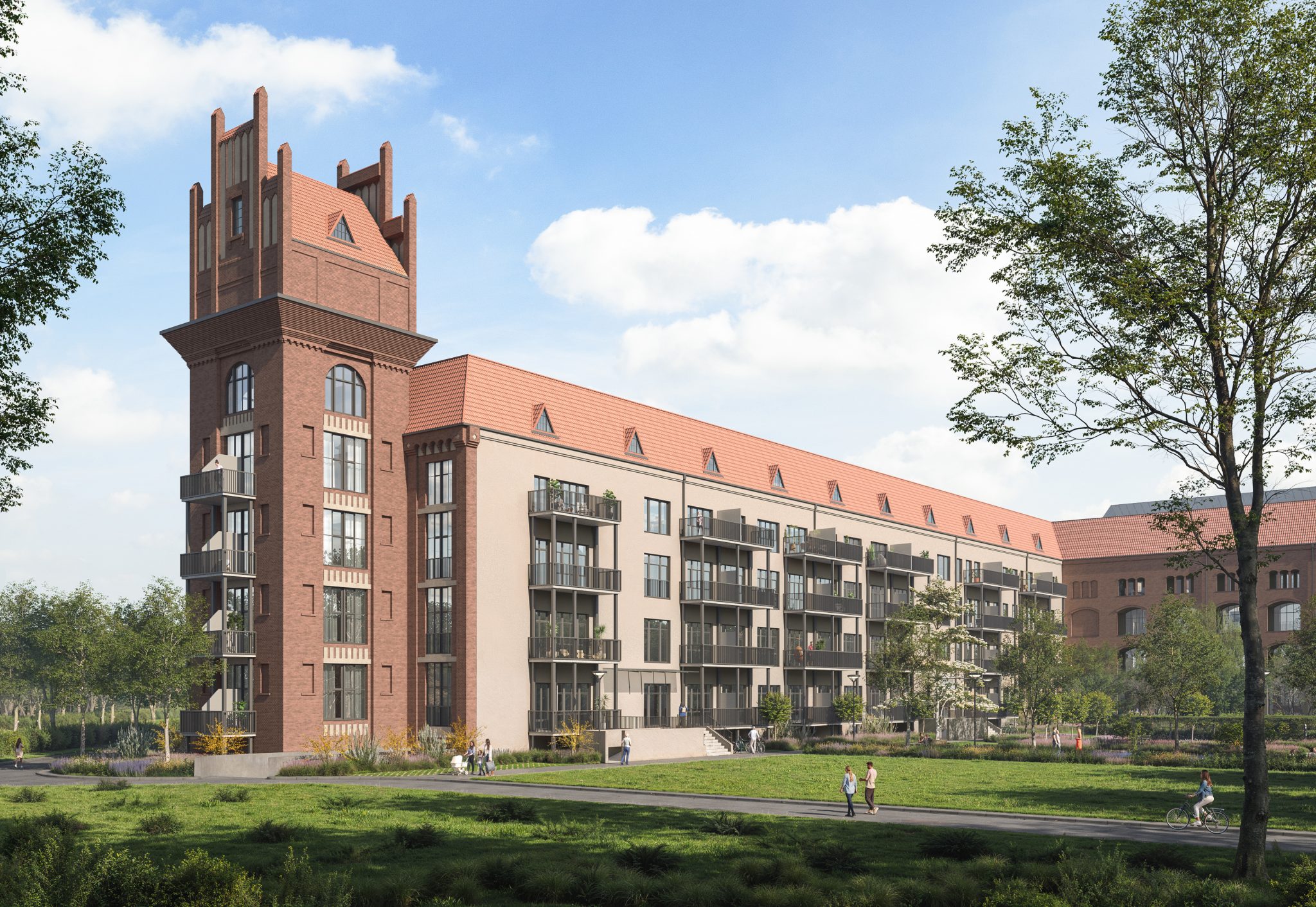 Jede Wohnung verfügt über einen Balkon, der einen reizvollen Blick auf die historische Kulisse eröffnet. Die parkähnlich gestaltete Außenanlage lädt